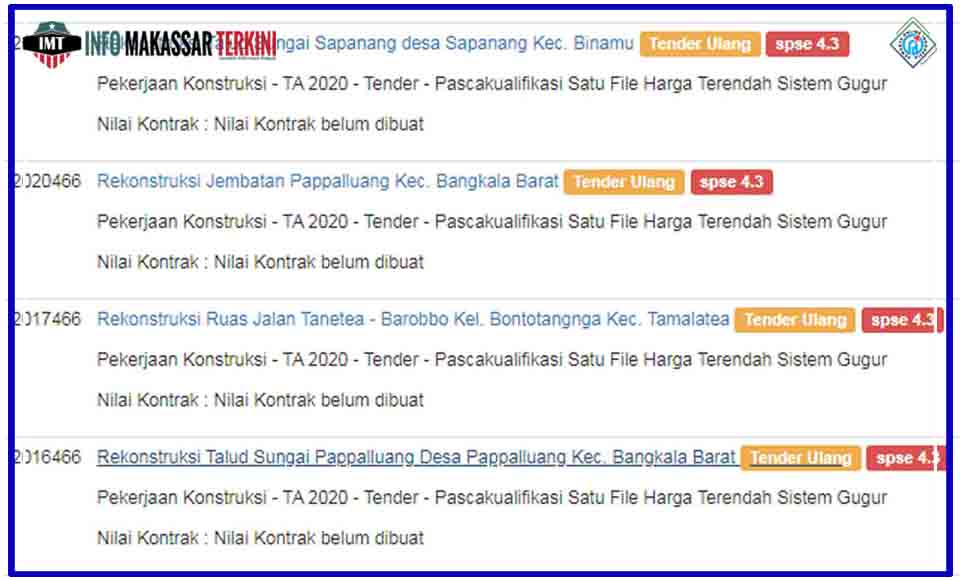 Kegiatan tender proyek yang diulang tersebut adalah :